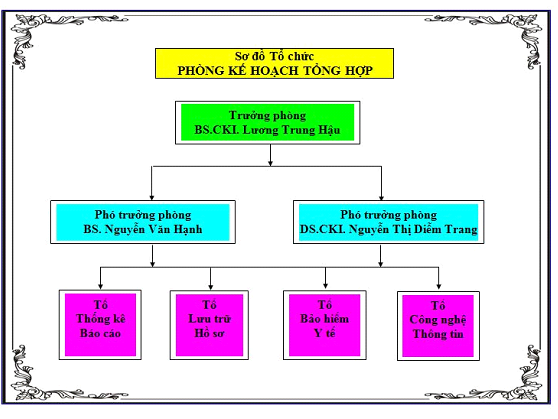 Về mặt tổ chức, phòng chia làm 4 tổ hoạt động, bao gồm: tổ Thống kê – Báo cáo; tổ Lưu trữ Hồ sơ; tổ Bảo hiểm Y tế; tổ Công nghệ Thông tin.