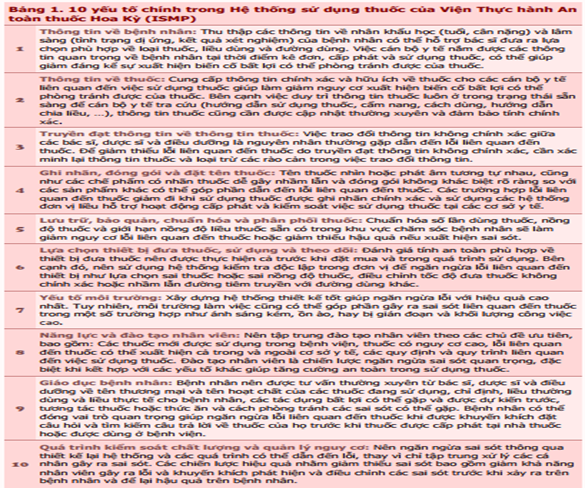 Vì vậy, việc rà soát nguy cơ liên quan đến sử dụng thuốc có thể bị bỏ sót (trừ trường hợp biến cố bất lợi xuất hiện thu hút sự chú ý của cán bộ y tế và cộng đồng) là một biện pháp hữu ích. Các nguy cơ được đề cập trong bài viết này nằm trong các vấn đề đã được đề cập trong 10 yếu tố chính trong Hệ thống sử dụng thuốc của Viện Thực hành An toàn thuốc Hoa Kỳ (ISMP) (bảng 1).