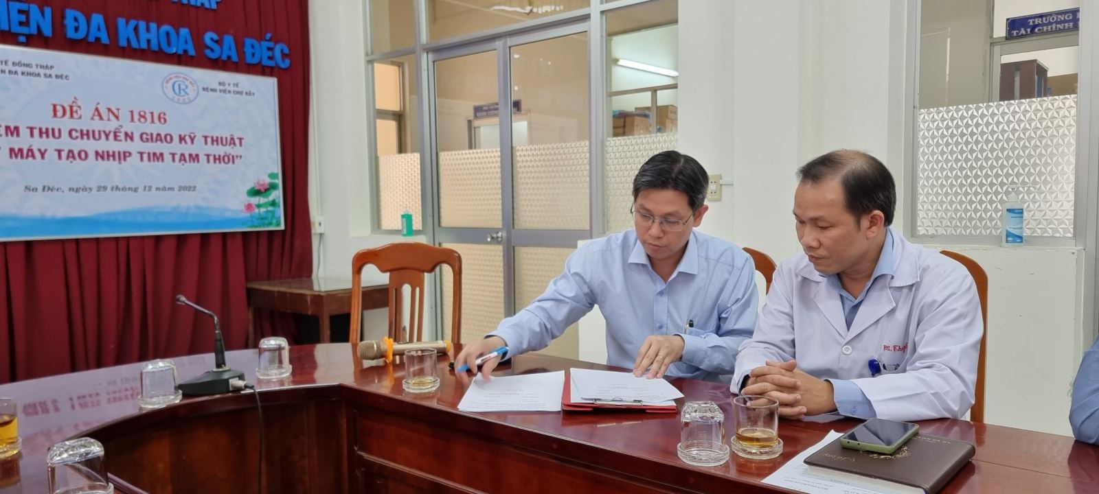 Ngày 29/12/2022, Bệnh viện Đa khoa Sa Đéc đã tổ chức buổi Nghiệm thu chuyển giao kỹ thuật “Đặt máy tạo nhịp tạm thời” thuộc Đề án 1816 do BSCKII Nguyễn Công Bằng, Phó Giám đốc bệnh viện chủ trì, bệnh viện rất vinh dự được đón tiếp Bs CKII Kiều Ngọc Dũng- Trưởng khoa Điều trị rối loạn nhịp Bệnh viện Chợ Rẫy và đại diện lãnh đạo Khoa Nội tim mạch - Lão học, khoa Phẫu thuật - Gây mê hồi sức, cùng các bác sĩ, điều dưỡng Bệnh viện đa khoa sa đéc đã tham gia vào đề án.