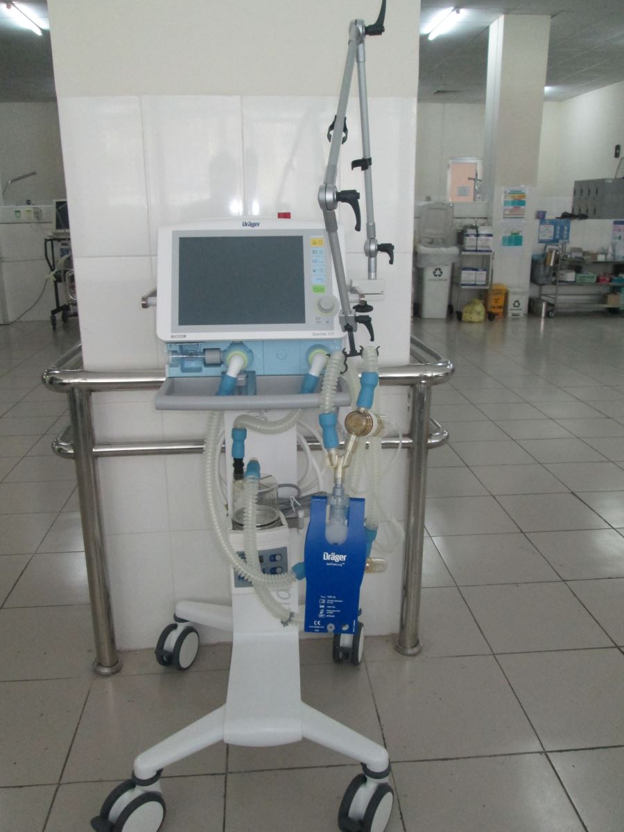 Máy trợ thở model Savina 300 – Classic, hãng sản xuất Dragerwerk AG & Co.KgaA – Đức, là loại máy thở đa năng không dùng khí trung tâm Savina 300 Classic/Select; công nghệ turbine bền bĩ, đáp ứng nhanh, không phụ thuộc khí trung tâm, lưu lượng đỉnh 250l/phút đáp ứng nhanh mọi nhu cầu thông khí của bệnh nhân. Máy X-quang di động cao tần model MUX-10 là loại x quang di động với xe đẩy gắn liền máy, có cột đỡ bóng X- quang quay ± 2700; bóng X-quang với tiêu điểm 0,7mm, dung lượng nhiệt 140 kHU, anode quay 3200 vòng/phút/60Hz do Hãng Shimadu - Nhật Bản sản xuất.