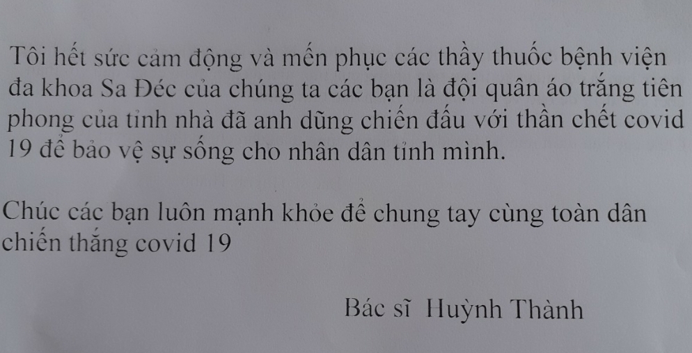 Nhân đây, Đại diện Đảng ủy, BGĐ Bệnh viện cùng toàn thể nhân viên y tế Bệnh viện Đa khoa Sa Đéc xin gửi đến TTƯT. Bs Huỳnh Thành – Nguyên Giám đốc Bệnh viện Đa khoa Sa Đéc cùng gia đình lời cảm ơn hết sức chân thành và lời chúc sức khỏe. Cảm ơn tất cả những lời động viên, chia sẻ của cộng đồng trên cả nước nói chung và tỉnh Đồng tháp nói riêng dành cho đội ngủ nhân viên y tế.